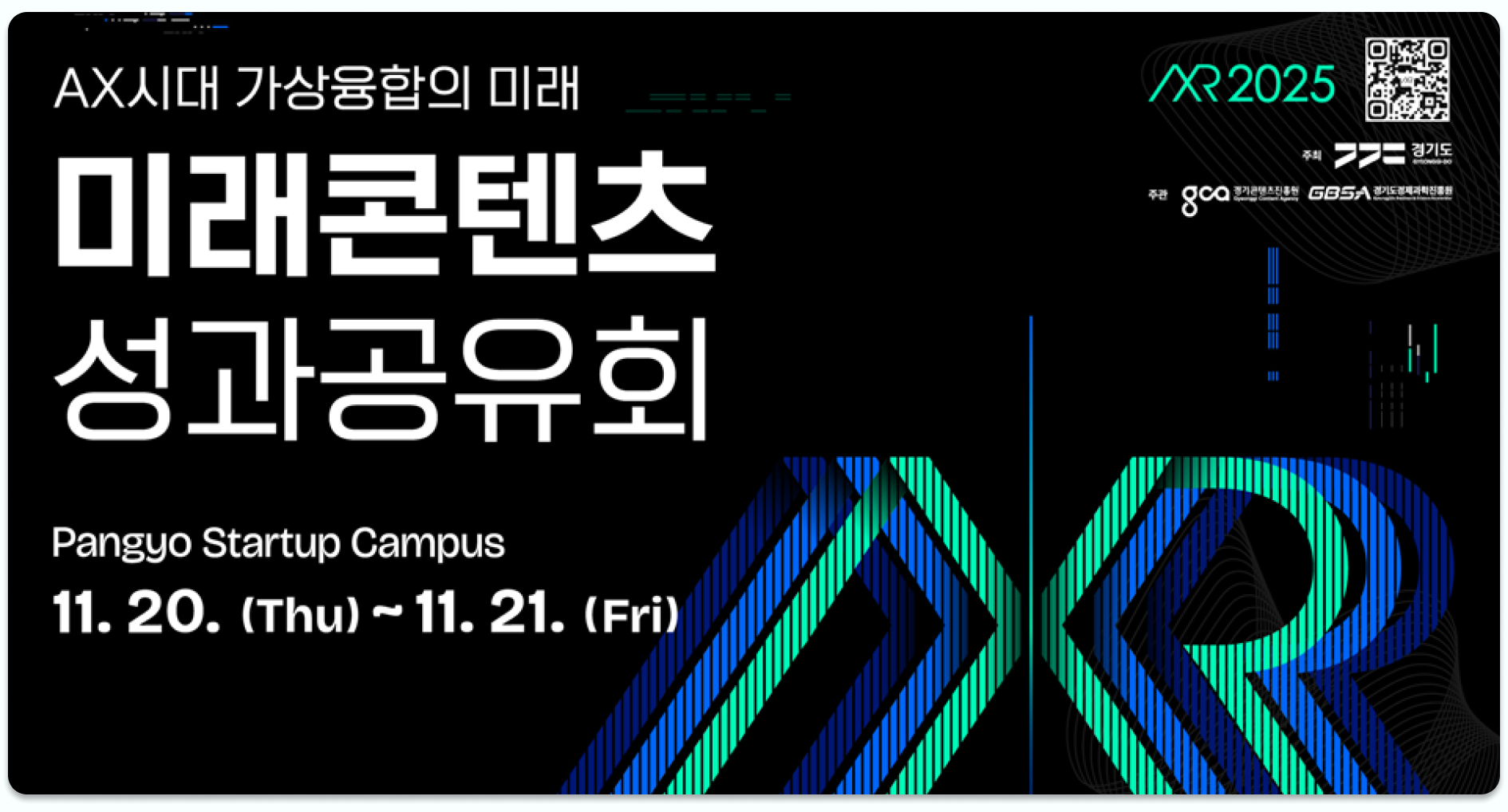 경기도와 경기경제과학진흥원, 경기콘텐츠진흥원에서 가상융합산업 성과공유회를 20~21일 판교 스타트업 캠퍼스에서 개최합니다. 본 행사에서 강조하는 단어인 AXR은 XR, 메타버스, 디지털 트윈등의 가상융합콘텐츠 등의 XR과 AX의 조합어로, AI기술이 가상융합산업 전반에 적용된 기술들에 대한 성과공유를 목적으로 합니다. |