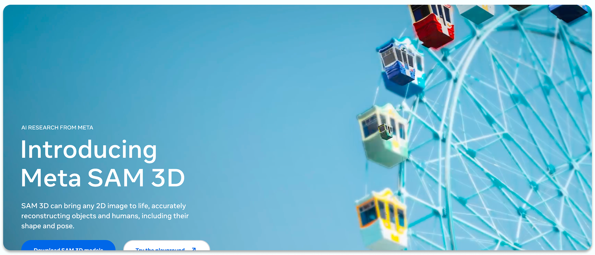 메타Meta가 이미지 모델 생성 AI, SAM 3D를 공개했습니다. 단 한 장의 평면 사진만 있으면 고품질의 입체 모델을 만들어내는 SAM 3D는, 여러 장의 사진을 찍어 합쳐야 했던 기존 방식과 달리, 인공지능이 사진에 보이지 않는 뒷면과 형태까지 스스로 추론해 모양과 질감을 완벽하게 복원해 내는 것이 특징입니다. |