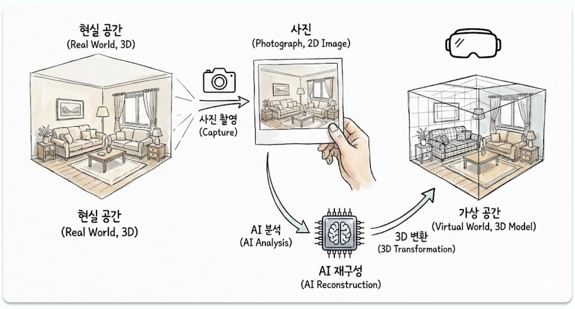엄밀히 말해 사진은 3차원의 공간을 촬영하여 2차원 평면으로 압축하는 '뺄셈의 기술'이었습니다. 반면 SAM 3D를 위시한 최신 AI 기술은 그 2차원 평면을 다시 입체적인 공간으로 되살려내는 정반대의 역학적 과정을 수행합니다. 이는 마치 사진의 반대급부와도 같은 복원의 과정입니다. |
