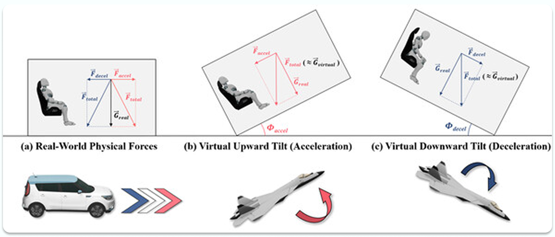 GIST 연구팀이 차량의 실제 가속·감속을 VR 속 ‘상하 이동 감각’으로 바꾸는 감각 재지향(Motion Reorientation) 기술을 개발했습니다. |