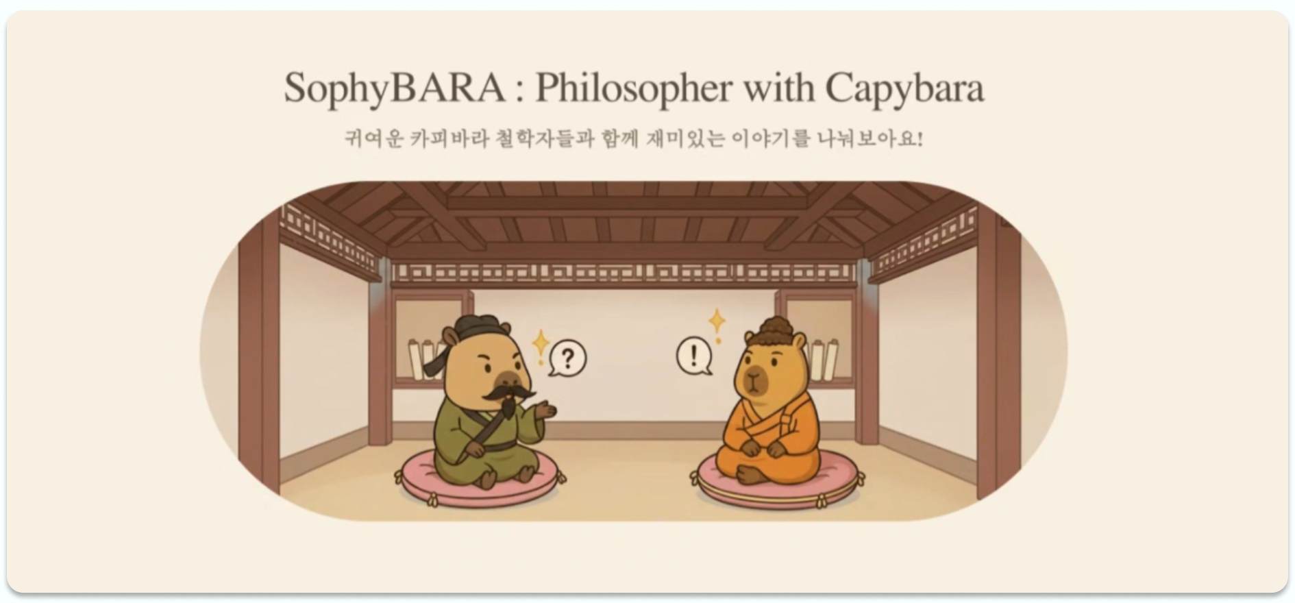 고전 철학자들의 이름을 달달 외우는 고등학교에서의 내신 및 수능을 위한 철학 교육이 아니라, 그들이 실제로 어떻게 질문하고, 어떤 방식으로 상대를 설득하고, 어디에서 한계를 드러내는지를 살아 있는 듯한 카피바라들의 대화 속에서 경험하게 만드는 것을 목표로 합니다. |