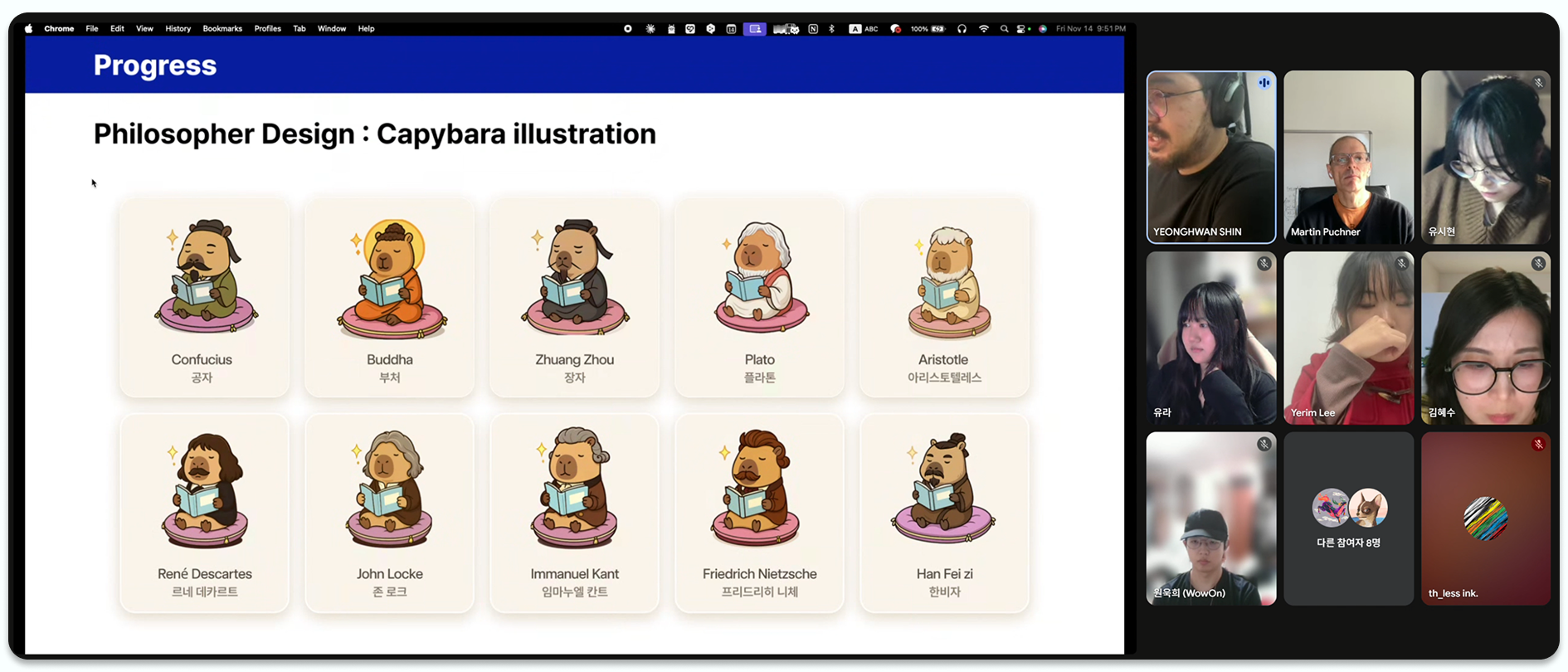 Virtual Dojo는 리서치, 설계, 개발, 디자인이 균형 있게 섞인 작은 연구 공동체입니다. 다양한 배경을 가진 구성원들이 한 팀을 이루어, 철학 교육, 인문학적 상상력, AI 기술, UX 디자인을 한데 엮는 작업을 함께 하고 있습니다. 여기에 프론트엔드 개발자와 추가 디자이너들이 외부 협력원으로 합류해 실제 서비스 수준의 완성도를 끌어올리고 있죠. |