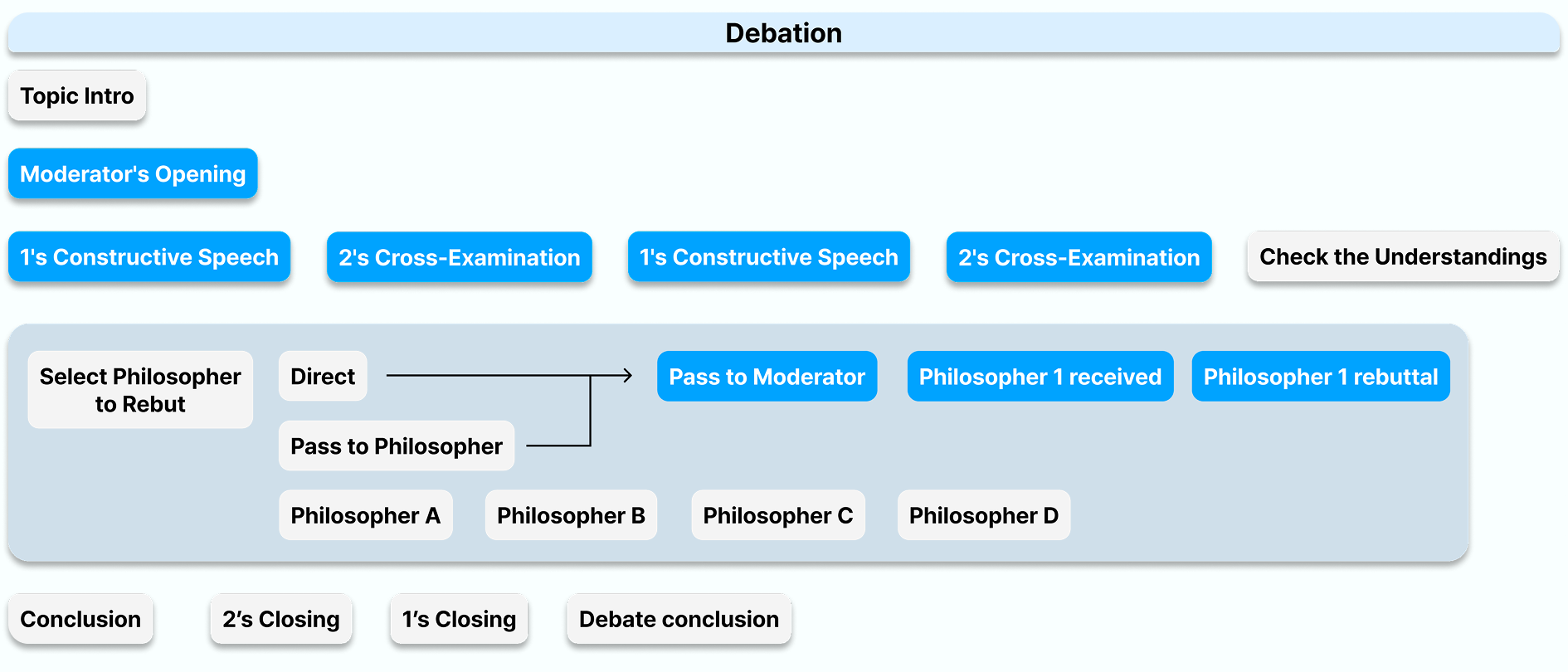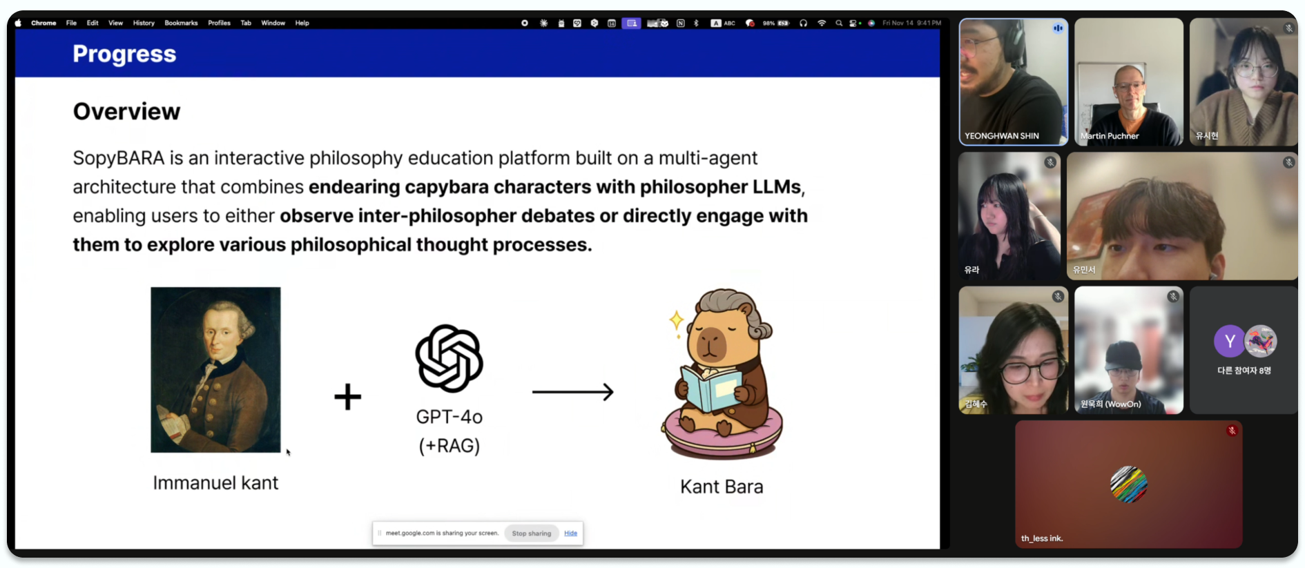 이들의 철학자 AI 에이전트는 단순히 똑똑한 철학자들을 모방하는 것이 목표가 아닙니다. 서로 다른 철학자 에이전트들이 하나의 장 안에서 토론하고, 조정자Moderator AI가 흐름을 정리하고, 사용자의 생각을 다시 되묻는 구조화된 토론 환경을 구축하는 것이 진정한 목표입니다. |
