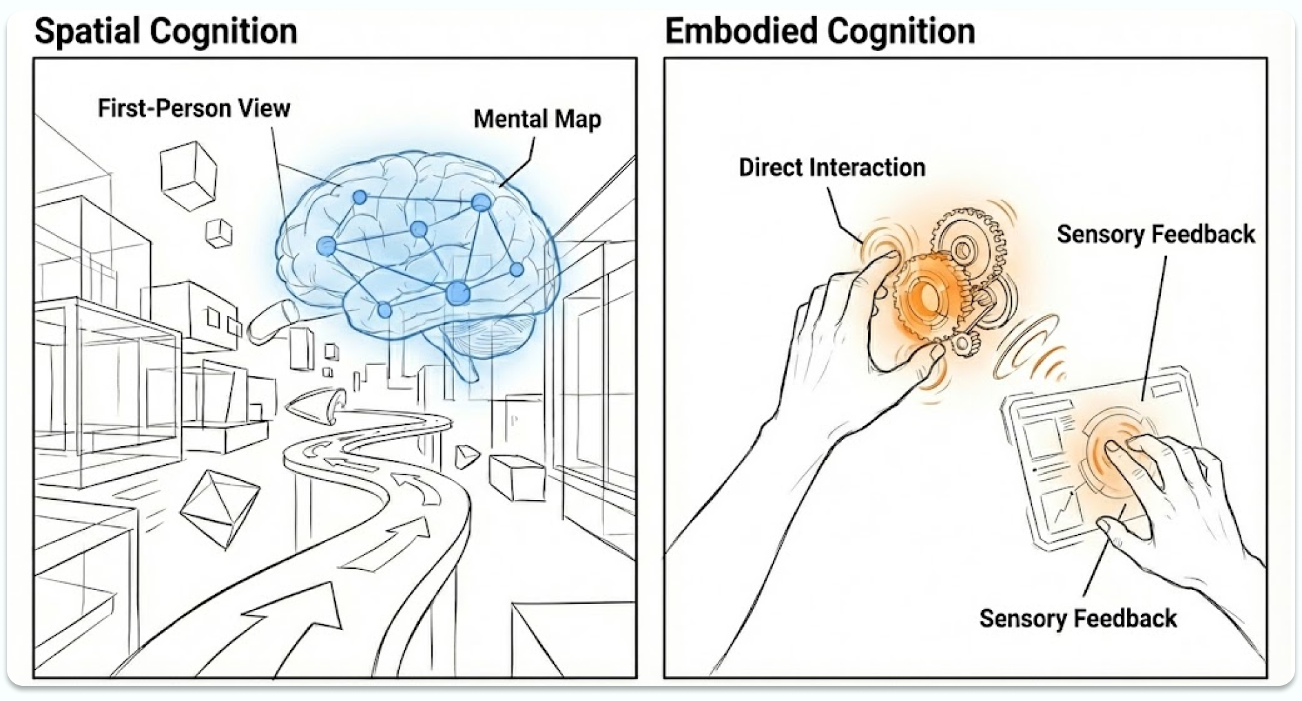 이번 XREAL 학회 특강에서 교수님은 이러한 관점을 바탕으로, Spatial & Embodied Cognition을 강조하셨습니다. 한국어로 번역하자면 사용자의 공간 & 신체 인지와 비슷하게 생각할 수 있겠는데요, 이는 XR UX를 관통하는 개념입니다. |