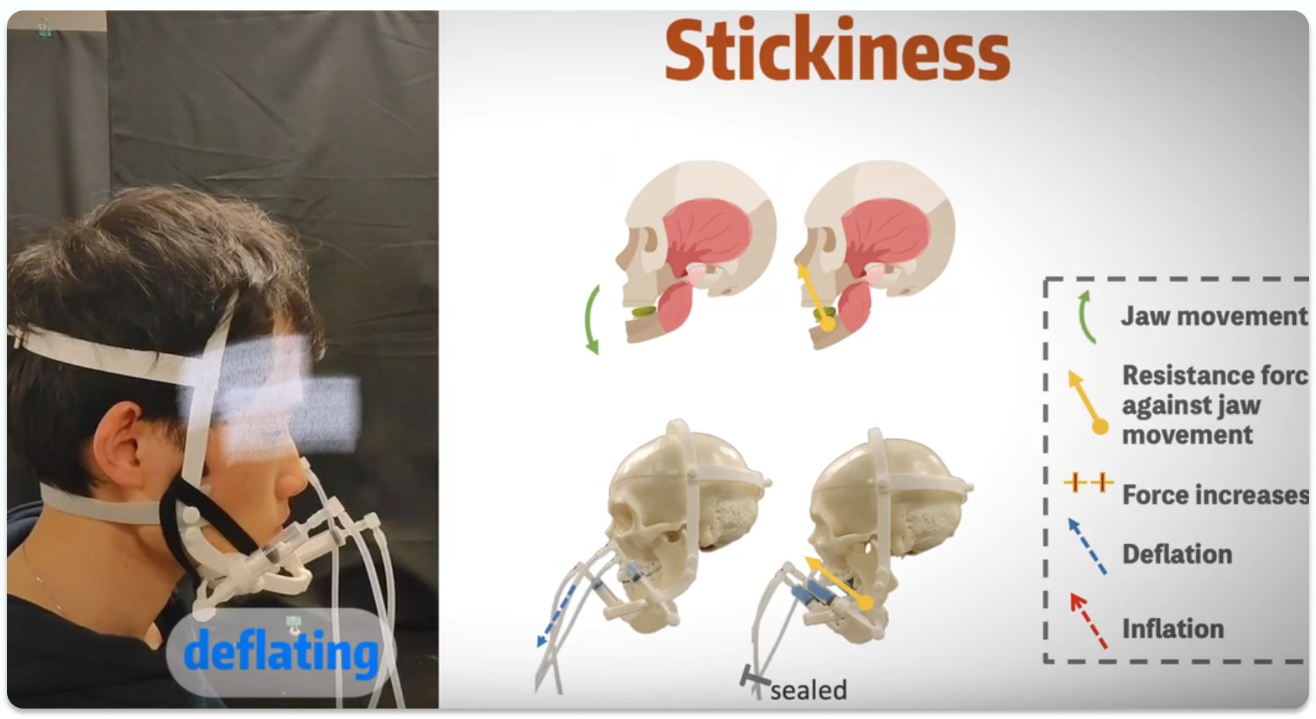 원리는 비교적 간단합니다. 직접 턱에 장치를 착용하면, 장치가 외부 공기압을 이용해 턱의 움직임을 제한하여, 음식의 딱딱함이나 식감을 현실적으로 느낄 수 있게 합니다. 메타 퀘스트3 등 VR 헤드셋과 연동이 가능하며, 약 -23N~+27N의 힘을 출력해 다양한 음식 섭취 시 감각을 표현할 수 있습니다. |