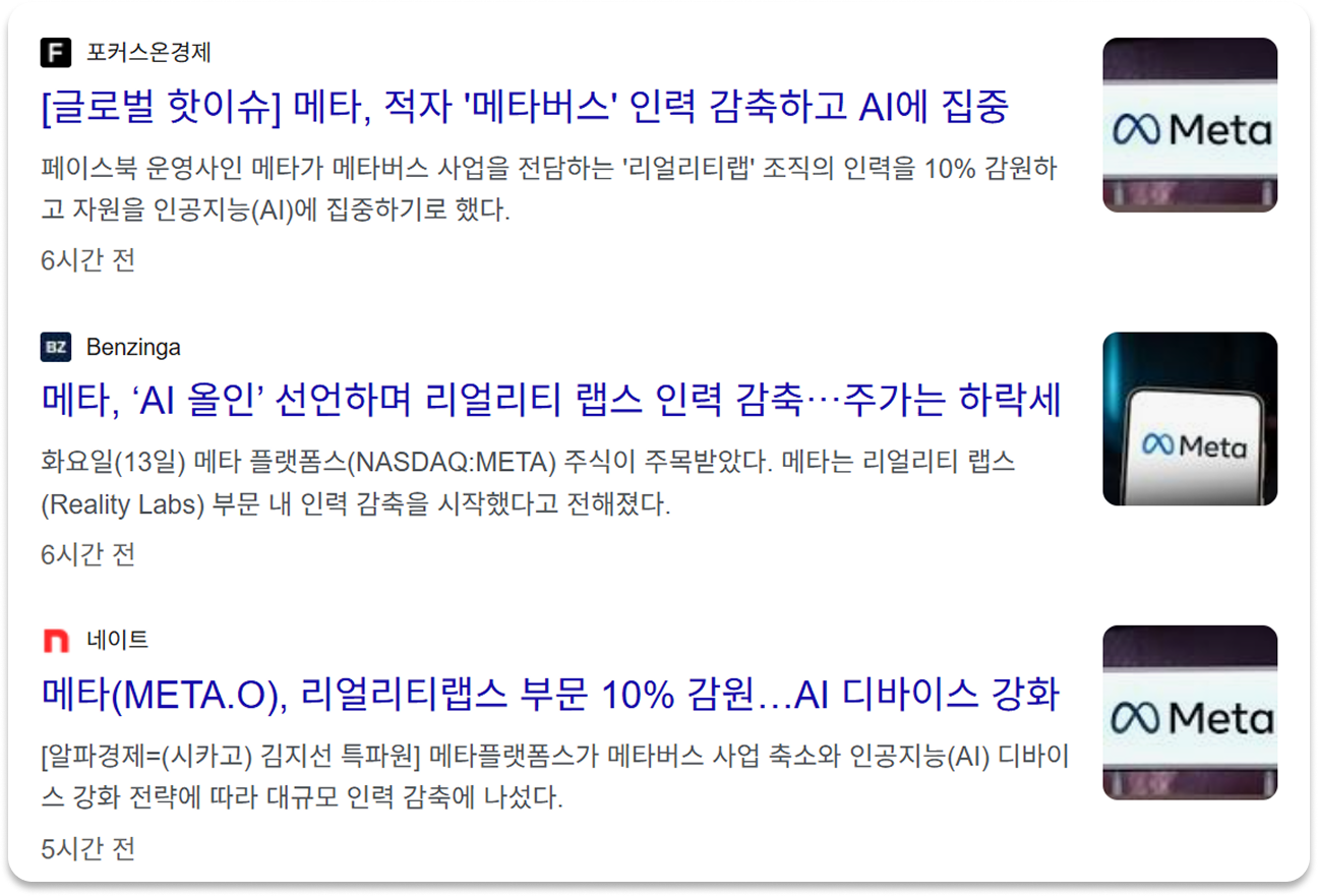 심지어 메타는 단 몇 년 만에 AI를 이용한 유의미한 광고 수익 구조를 갖추었고, 대중들이 AR 안경에 대한 높은 관심을 보이는 만큼, VR 관련 사업부의 축소는 예정된 수순이었다고 볼 수 있습니다. |