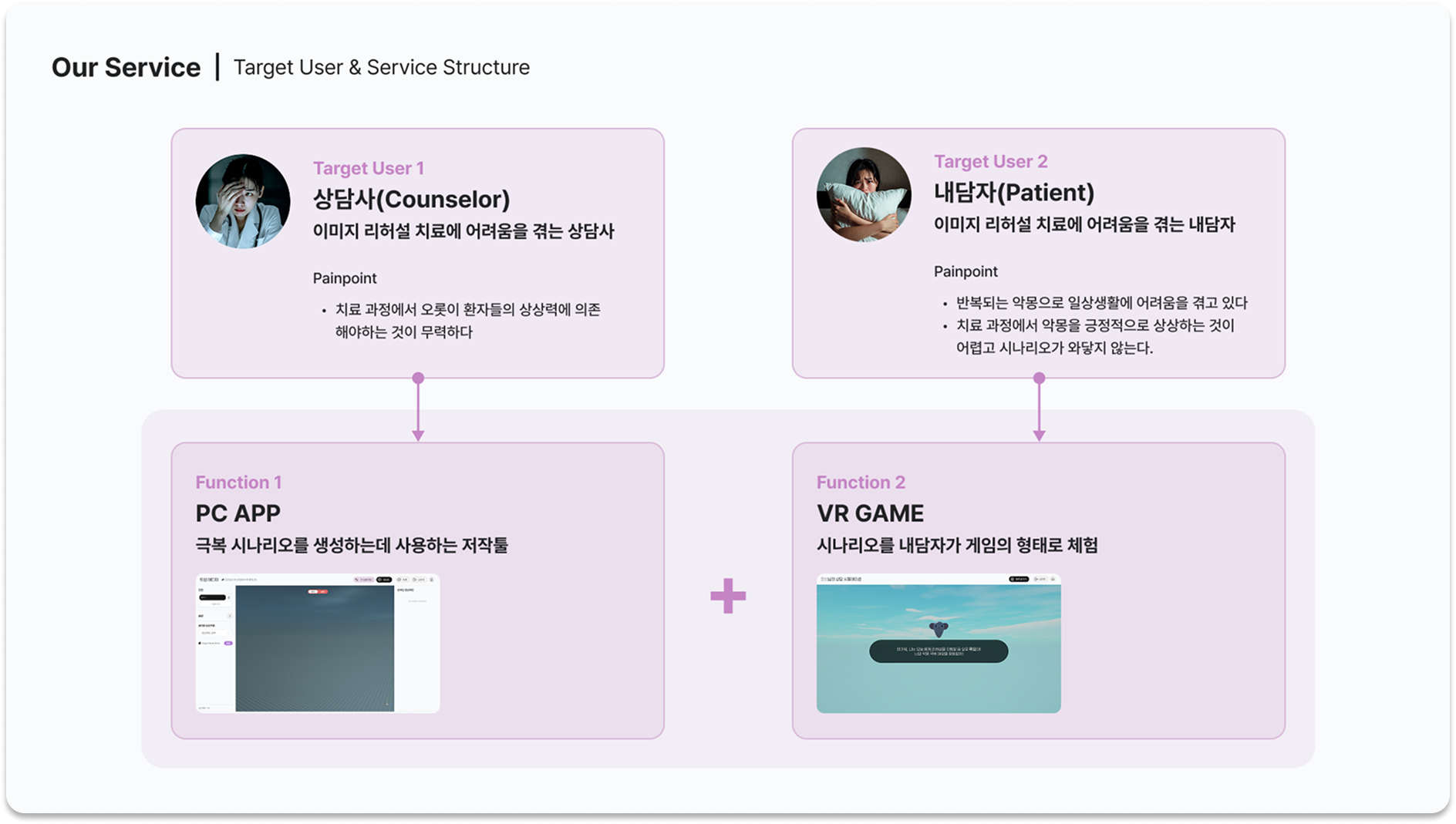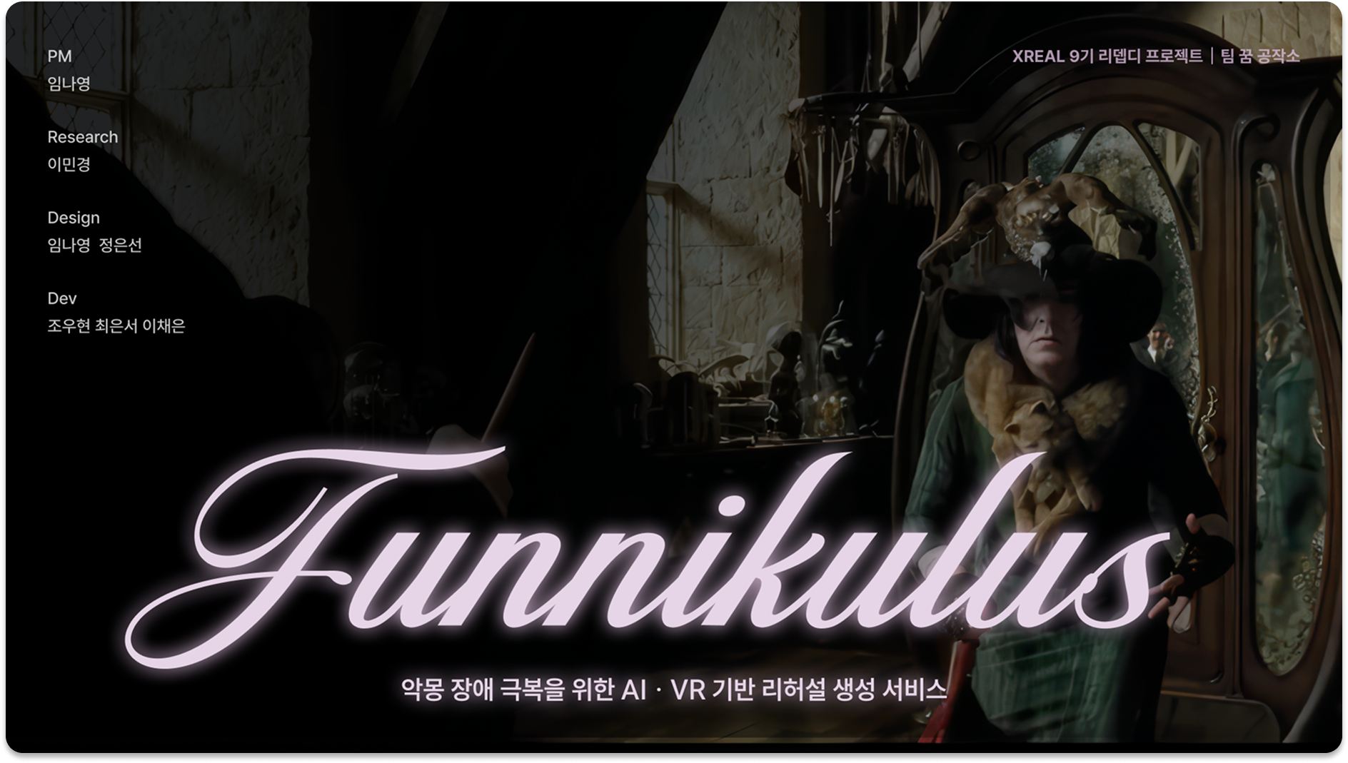 또한 이 팀은 이를 MVP로 구체화하기 위해, XREAL 리뎁디 프로젝트 기간 동안 리서치, 디자인, 개발 주니어 팀원들은 꾸준히 노력을 해왔습니다. 악몽 장애 관련 전문가 인터뷰를 통해 치료 구조를 설계하고, 실제 악몽 사례를 바탕으로 한 XR 공간을 제작하였으며, 생성형 AI와 서비스를 연동하여 상담자 입장에서의 사용성을 증대하였죠. |