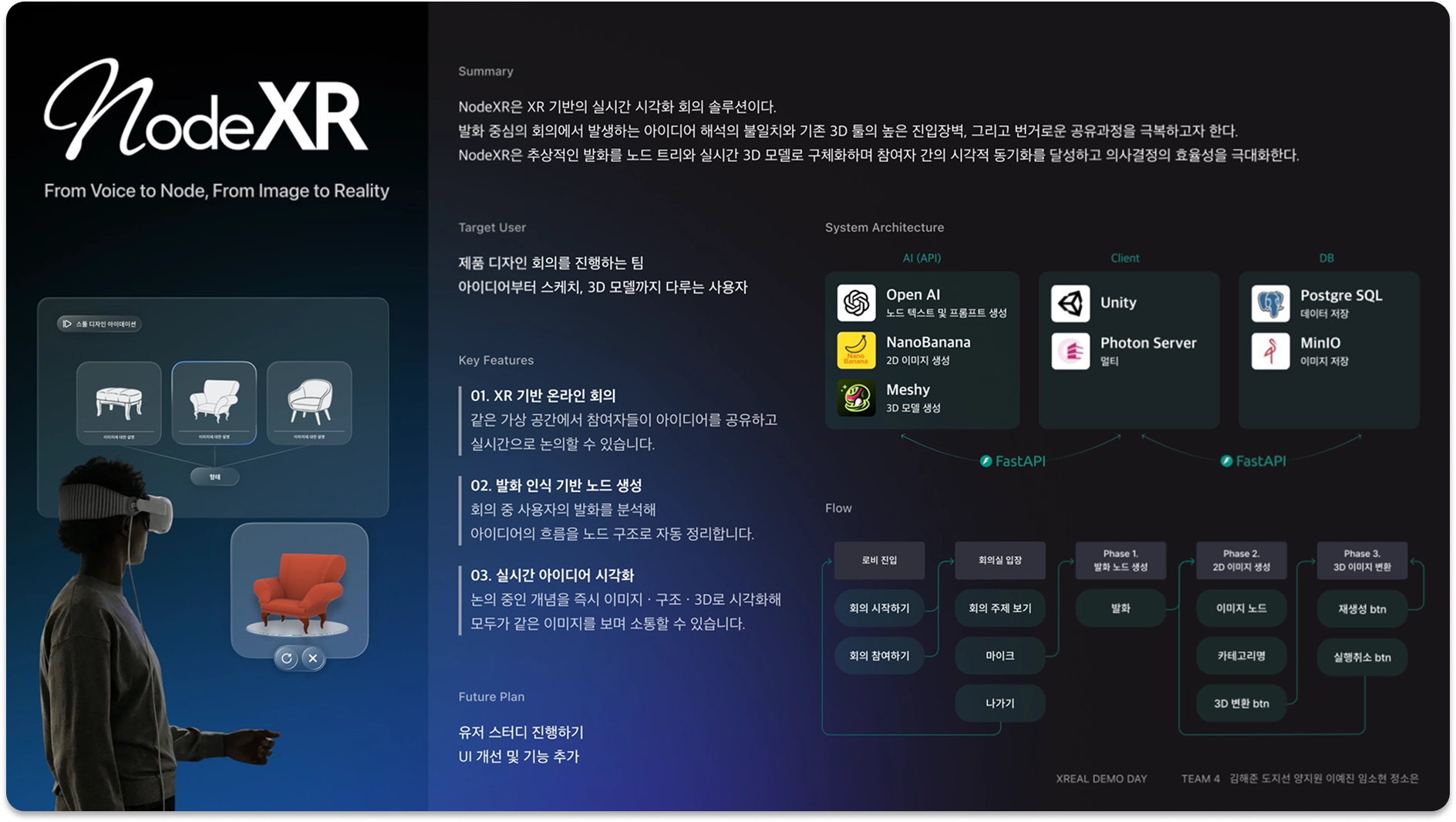 NodeXR은 말로만 전달되는 아이디어의 불명확성과 기존 3D 툴의 높은 진입장벽을 해결하기 위한 XR 기반 실시간 시각화 회의 솔루션입니다. |