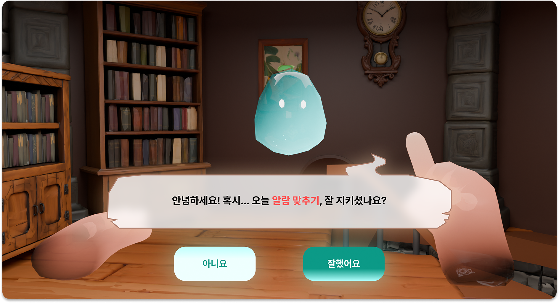 미러디는 사용자 중심적 프로젝트 설계가 특히 눈에 띕니다. 대화형 에이전트를 XR 공간에 배치하여, 3~5턴 분량의 짧은 대화를 나누고, 이를 바탕으로 생성되는 키워드 캐릭터를 제시합니다. 키워드 캐릭터는 유저와의 감정적 연결감을 줄 수 있고, 유저에게 동기부여를 담당하는 캐릭터로, 무엇보다 귀엽습니다. |