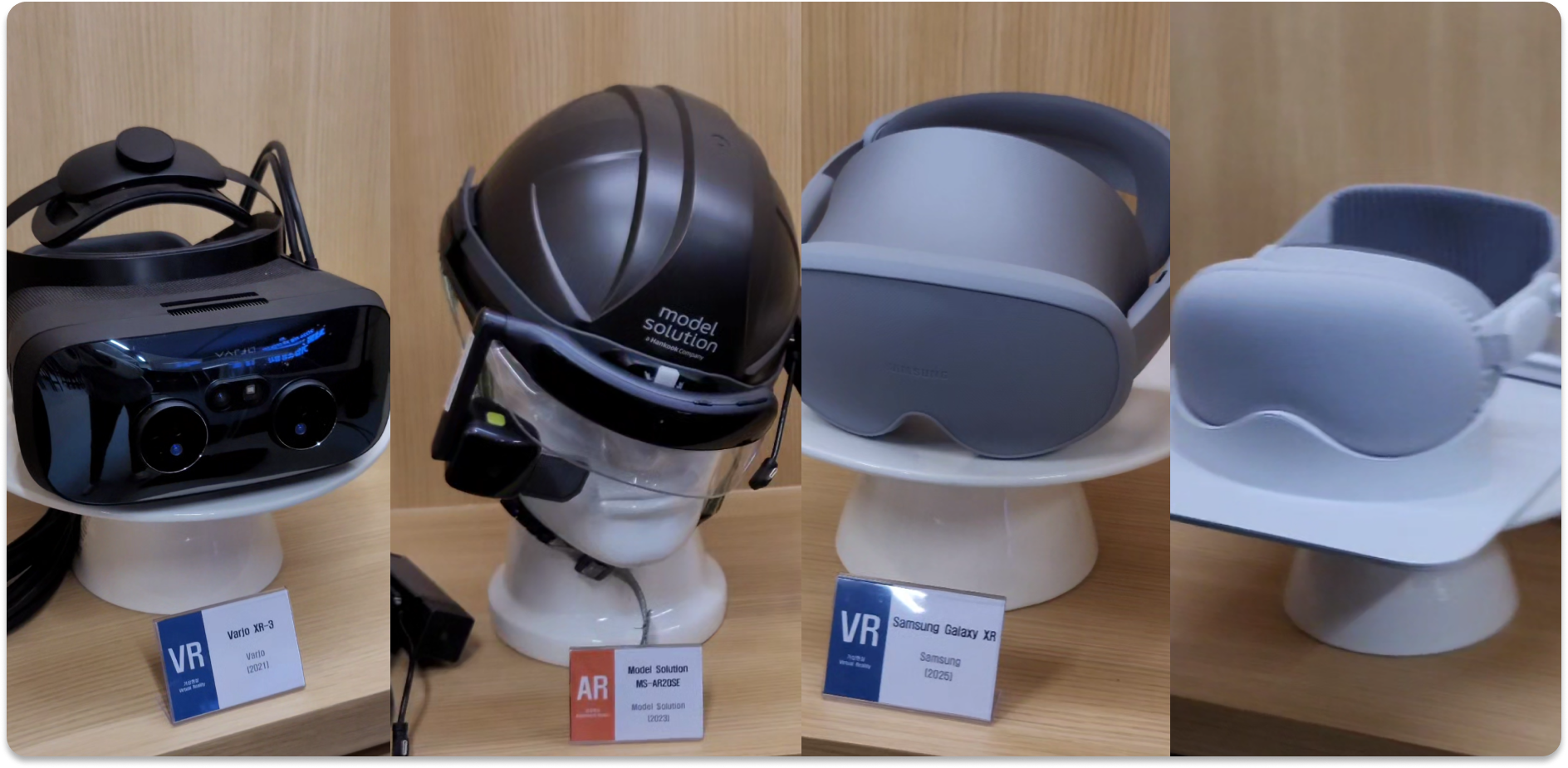 다만, 아직 하드웨어와 XR 콘텐츠 자체에 더 관심이 많은 학생 신분으로서는, 다른 곳에 눈길이 더 가더군요. 현존하는 거의 모든 XR 디바이스들이 8층에 즐비합니다. 비전 프로? 당연히 있죠. 갤럭시 XR과 바르요Varjo? 물론 있습니다. 대학 강의에서 제가 소개하고, 교수님들도 잘 모르셨던... AR 보조 장비들 또한 '당연히' 있죠. |