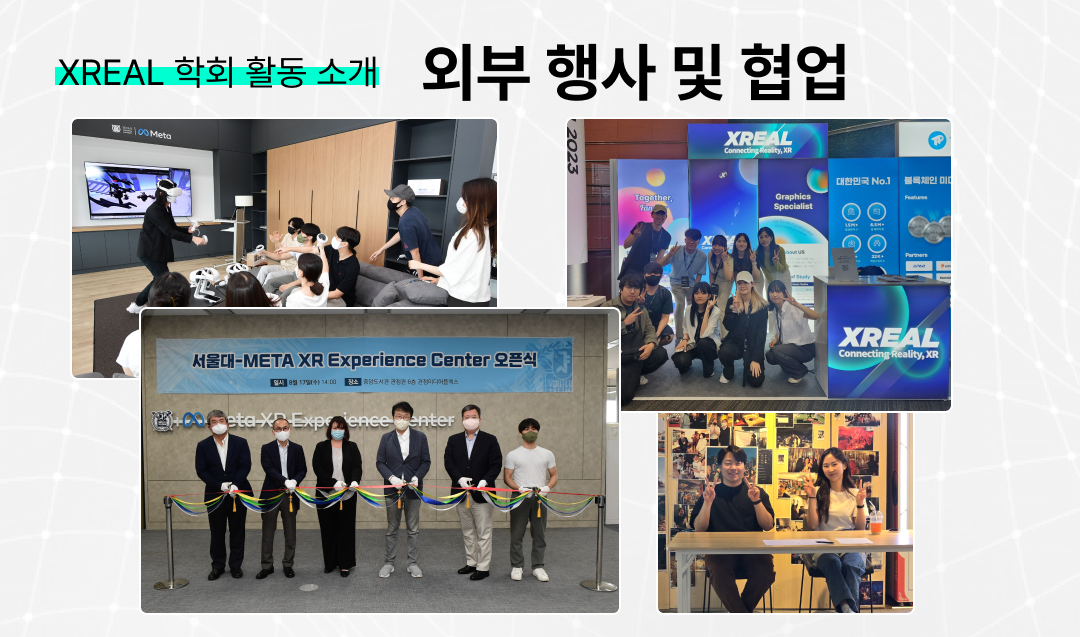 서울대학교 기반 XR-AI 학회 XREAL은, 그 이름만 기반이 아닙니다. 서울대학교 동아리로 시작한 1기부터, 4기부터는 실제로 서울대-META XR 체험 센터를 적극적으로 활용하고, 그 오픈식에도 회장이 참여하며 교류를 이어왔습니다. |